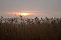 Close up van het riet bij Park Lingezegen waterrijk in Elst, Gelderland, onder een prachtige zonsopkomst, waar de zon tussen de wolken komt piepen.