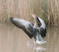 Close up van een grauwe gans die zijn/haar vleugels spreidt. De foto is gemaakt met een telelens bij waterrijk west van park Lingezegen.