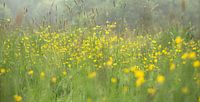 Panorama foto van een weiland vol met boterbloemen tussen het frisse lentegroen.