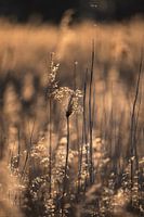 Close up van de grassen op Park Lingezegen in Elst, Gelderland. Het is een zonnige lente avond en de zon is aan het zakken. Het gouden uurtje zorgt voor een warme en gouden gloed over de rietstengels.