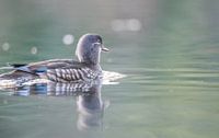 close up van een mandarijneend vrouwtje, in de grote vijver van Sonsbeek park in Arnhem, Gelderland, in het warme licht van de ochtendzon