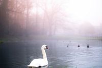 landschap in park Sonsbeek in Arnhem, Gelderland, met een prachtige zwaan op de vijver op een mistige morgen in de herfst