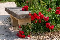 Een parkbank omringd door rozen in een kasteeltuin in Zuid-Frankrijk. Hier kun je gaan zitten om te wachten op Prince Charming.