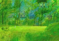 Het schilderij "Car Park" neemt de kijker mee naar een betoverende wereld vol romantiek en onverwachte ontdekkingen. De overheersende sterke groene tinten creëren een sfeer van weelderig leven en frisheid en benadrukken tegelijkertijd de geheimzinnigheid van het bos.