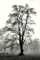 Bomen in het Nordpark in Magdeburg in de vroege ochtend voor zonsopgang in lichte mist