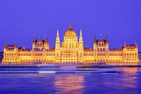 Het Hongaarse parlement in de hoofdstad Boedapest tijdens het blauwe uur, met de Donau op de voorgrond.