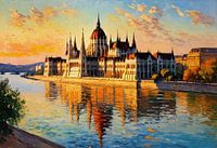 Het Hongaarse parlement gloeit langs de Donau, zijn neogotische torens zijn geschilderd in warme gouden strepen als de schemering valt. De rivier glinstert met golvende reflecties van rode daken, torenspitsen en zachte amberkleurige lichten. Impressionistische penseelstreken verzachten de grootse gevel tot een dromerig silhouet, waarin geschiedenis samensmelt met de zachte dans van avondkleuren. Dit kunstwerk vangt de geest van Boedapest - een tijdloze harmonie van elegantie, vitaliteit en de romantiek van een stad aan het water.