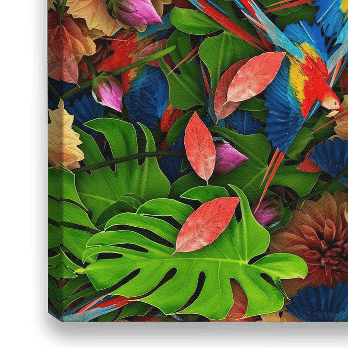 Patroon van bloemen, planten en papegaaien met een jungle thema. Kleurrijk met rode, gele, groene en blauwe tinten.