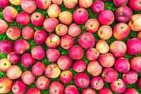 Groep rode appels liggen uitgespreid op gras. Vers geoogst heb ik dit fruit gespreid op het gazon in mijn tuin gelegd. De oogst was goed dit jaar. Een kleurrijke afbeelding vanwege de rode en gele kleur.