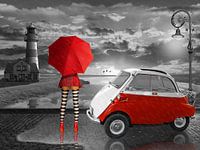Sexy vrouw in minirok en hoge hakken van achter, met rode paraplu naast een klassieke auto Isetta.