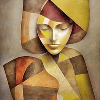 Abstract portret van een vrouw. Een collage in aardetinten met mosterdgele en bordeauxrode accenten