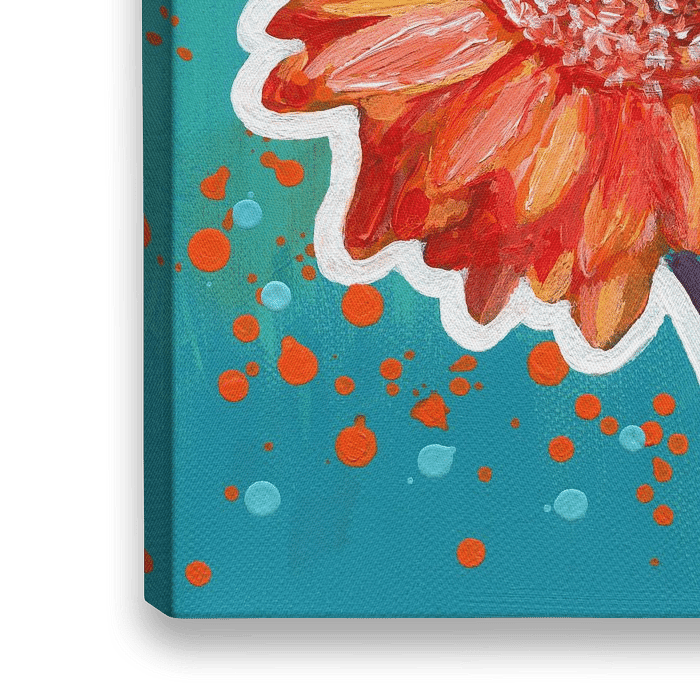 Schilderij van gerbera in felle, contrasterende kleuren met een witte omlijning.