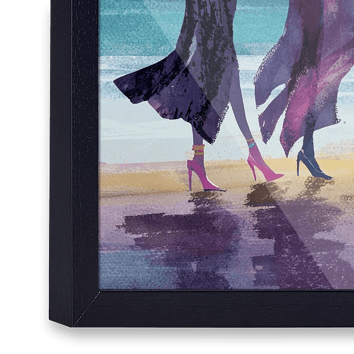 Illustratie van vier vrouwen in kleurrijke jurken die langs het strand lopen bij zonsondergang — levendige en sfeervolle kunst illustratie.
