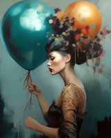 Impressionistisch fantasie portret van een vrouw met ballonnen en confetti.