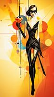 Een jonge vrouw op een nachtclubfeest, helemaal in het zwart gekleed en met een zwarte bril op, houdt een extravagant, te groot cocktailglas vast. Op de achtergrond zijn de lichten van een discotheek aangegeven in rood, geel en oranje, wat een kleurrijk contrast vormt met de dame in het zwart.