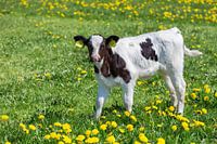 Pasgeboren zwart bont kalfje staat in weide met gele paardenbloemen. In de lente mocht dit kalf van de boer genieten van de zon. Nieuwsgierig kijkt het dier naar de camera.