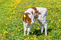 Pasgeboren roodbont kalfje staat in groene weide met bloeiende gele paardenbloemen. In het voorjaar mag dit landbouwdier naar buiten op deze zonnige lentedag om te genieten van de buitenlucht en het verse groene gras.