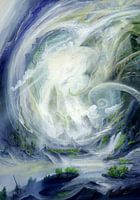 In dit fascinerende schilderij smelten slakachtige formaties, buizen en spiralen samen tot een surrealistische wereld. De verhogingen en depressies, die buigen als continentale platen, geven het landschap een organische en levendige dimensie. Het spel van licht en schaduw benadrukt de contouren van deze structuren en geeft het schilderij een dynamische sfeer. Op het eerste gezicht lijkt het landschap raadselachtig, maar een nadere blik onthult een veelheid aan fijne details en nuances.