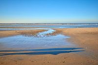 Passanten die voorbijgaan op het Noordzeestrand bij Noordwijk aan Zee.