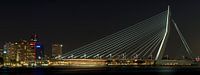 Nachtfoto van de Erasmusbrug. Een boot vaart onder de brug door, door de lange sluitertijd zie je alleen de strepen van de lichtjes van de boot.