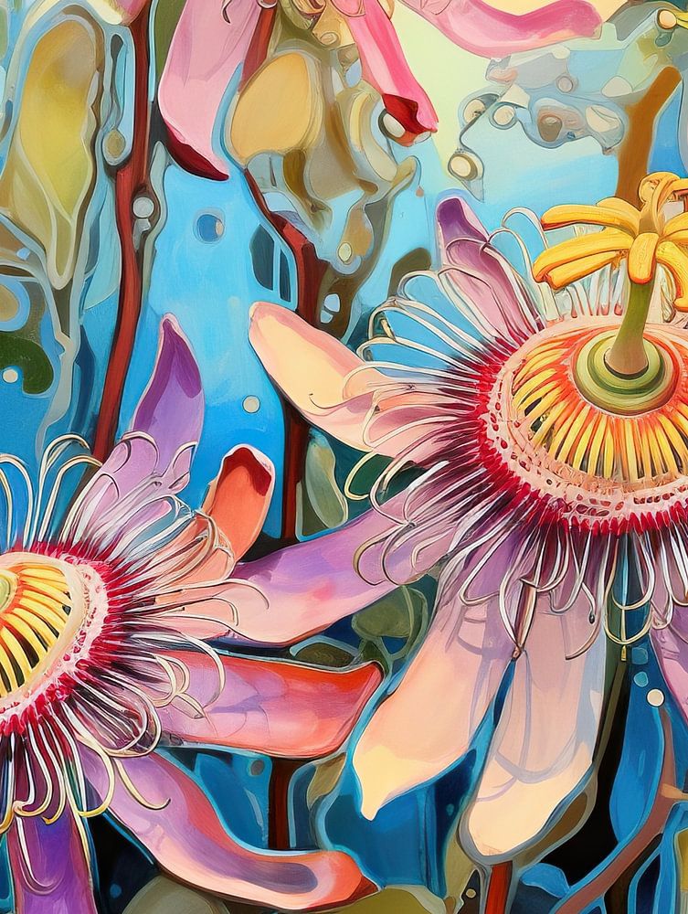 Details: passiebloem, bloemenschilderij, kleurrijk schilderij, abstracte kunst, flora, natuur, botanisch, artistiek, decoratief, moderne kunst