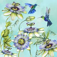 Passiebloemen met hummingbirds in aquarel in blauwe kleuren.