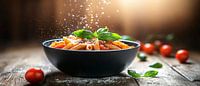 Koop de foto Pasta genieten met verse basilicum van Poster Art Shop op canvas, aluminium dibond, (ingelijste) fotoprint, behang en ArtFrame, op maat geprint in Fine-Art kwaliteit.