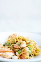 Eigen gemaakte spaghetti met scampi's. Van genoten op een zomerse avond in het plaatsje Elburg. De spaghetti lag op een wit servies en de achtergrond was een witte stenen muur.