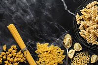 Op een tafel liggen verschillende soorten rauwe pasta. Er is spaghetti, farfalle, spirelli, tortellini en andere. De basis is een donkere marmeren tafel.
