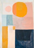 Pastel Abstract | Zacht Geometrische Vormen - Dit abstracte schilderij toont een harmonische compositie van pastelkleurige vlakken en cirkels, waarin zachte roze en oranje tinten gecombineerd worden met diepe blauwe en neutrale beige elementen, wat een rustige en evenwichtige uitstraling geeft.