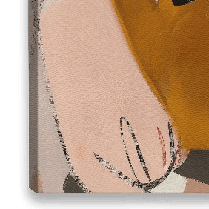 Hippe illustratie, modern portret. Dit werk toont een gestileerde, elegante vrouw met een rustige maar zelfverzekerde uitstraling. Haar blik is direct en krachtig, met dieprode lippen en opvallende roze blush op haar wangen. Ze draagt een mosterdkleurige top met een witte kraag en een zwarte stropdas-achtig detail, gecombineerd met…