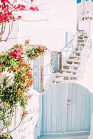Een pastel blauwe poort op het eiland Santorini in Griekenland
