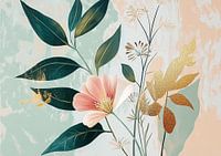 Pastel Bloom Aura - Dit bloemen schilderij toont een elegante compositie van diverse bloemen en bladeren met accenten van goud op een pastelkleurige achtergrond, waarbij een grote roze bloem met gele meeldraden centraal staat.