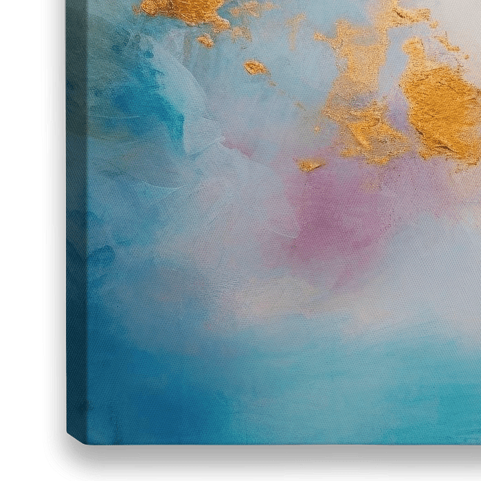 Abstracte schilderij met een mix van levendige pastelkleuren, waaronder blauw, roze en goud. Ze vloeien samen en creëren zo een dromerig en etherisch geheel. Het is een vervaagd natuurbeeld. De gouden accenten doen ons herinneren aan de kostbaarheid van de natuur. De…
