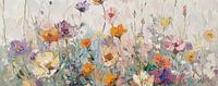 Dit kunstwerk toont een uitgestrekt bloemenveld, gevuld met een rijke variatie aan kleuren en texturen.