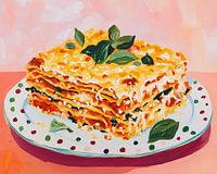 Pastel Lasagne | Lasagne Kunst - Dit culinaire schilderij toont een smakelijk stuk lasagne op een gedecoreerd bord, omgeven door een zachte pastelkleurige achtergrond die bijdraagt aan de vrolijke en uitnodigende sfeer van het gerecht.