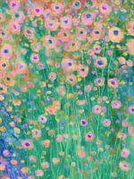 Grasgroene stelen rijzen als fluïde lijnen tussen zachte pastelbloemetjes in perzik, lavendel en mint. Elke bloemcirkel lijkt te zweven op een tapijt van frisse kleurvlakken, met subtiele glans in de puntjes en een lichte korrelstructuur die het werk tactiel maakt. Geïnspireerd door het ontwaken van wilde bloemen in het vroege voorjaar, straalt dit stilleven optimisme en vernieuwing uit zonder te overheersen. “Pastel Lentetapijt” nodigt uit tot telkens nieuwe ontdekkingen: zoek de fijne wisselwerking tussen stelen en stippen, en voel de energie van lentestralen op je muur.