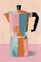 Een moderne, gestileerde interpretatie van een iconische moka pot in een verfrissend kleurenpalet van turquoise, zachtroze en oranje. De geometrische vormen en het minimalistische design creëren een hedendaagse twist op een klassiek keukenobject, waarbij de textuurrijke vlakken een handgeschilderd effect suggereren tegen een rustgevende pastelachtergrond.