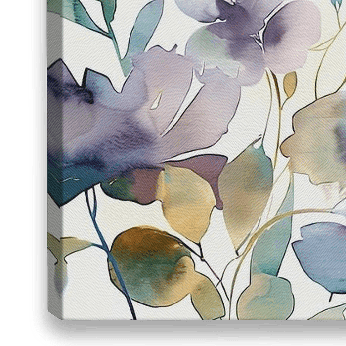 De kleuren variëren van groen en blauw tot subtiele tonen van paars, beige en goudachtig bruin. De penseelstreken zijn delicaat en geven elk bloemelement een zachte, dromerige uitstraling. De bladeren en…