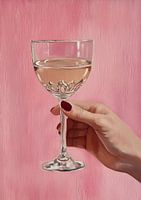 Olieverfschilderij van een vrouwelijke hand die een champagneglas vasthoudt met een roze achtergrond en witte wijn in het glas. Gedetailleerd en hoge resolutie.