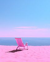 Dit kunstwerk portretteert een enkele roze strandstoel op een ongerept, pastel roze zandstrand.