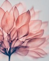 Een delicate close-up van doorschijnende roze bloemblaadjes met zacht licht en fijne nerven, die een dromerige, etherische bloemenesthetiek creëren.