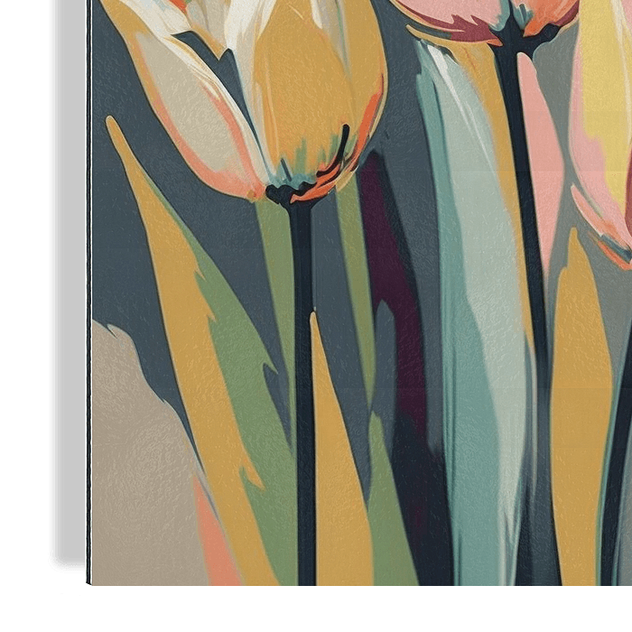Mixed media illustratie met pastelkleurige tulpen in retro stijl.