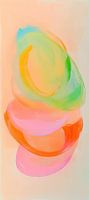 Pastel Vormen - Dit abstracte schilderij toont een reeks gelaagde, dynamische vormen in zachte tinten, waarbij de nadruk ligt op grote, vloeiende cirkels in pastelgroen, oranje en roze die over elkaar liggen op een lichte achtergrond.