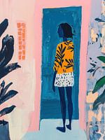 Pastel Vrouw - Dit figuratieve schilderij toont een vrouw van achteren gezien die een deuropening inloopt, omgeven door expressieve, kleurrijke blokken van pastelkleuren en zachte texturen, waarbij het contrast tussen de donkere deur en haar felgele trui met bladmotieven opvalt.