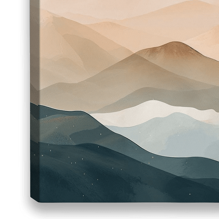 Een kunstwerk van bergen in pasteltinten, met zachte penseelstreken die de contouren en details van de bergketen accentueren. De kleuren variëren van lichtblauw en zachtroze tot crèmekleurig, waardoor een rustgevende en serene sfeer ontstaat. Het natuurlijke licht werpt een warme gloed over de bergen, wat een gevoel van vrede en…