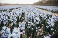 Uitgestrekte velden van bloemen in de natuur van het Hollandse landschap. Lente in de Duin en Bollenstreek.