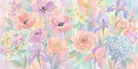 Een dromerig, impressionistisch bloemenveld in zachte pasteltinten. Losse penseelstreken en vloeiende vormen creëren een rustige, lichte en romantische sfeer die doet denken aan de lente.