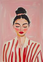 Olieverfschilderij van een moderne vrouw met een knotje en rood-wit gestreept shirt tegen een roze achtergrond in een minimalistische stijl met zichtbare penseelstreken, pastelkleuren en zachte belichting, die een gevoel van vredig expressionisme en romantiek overbrengen.