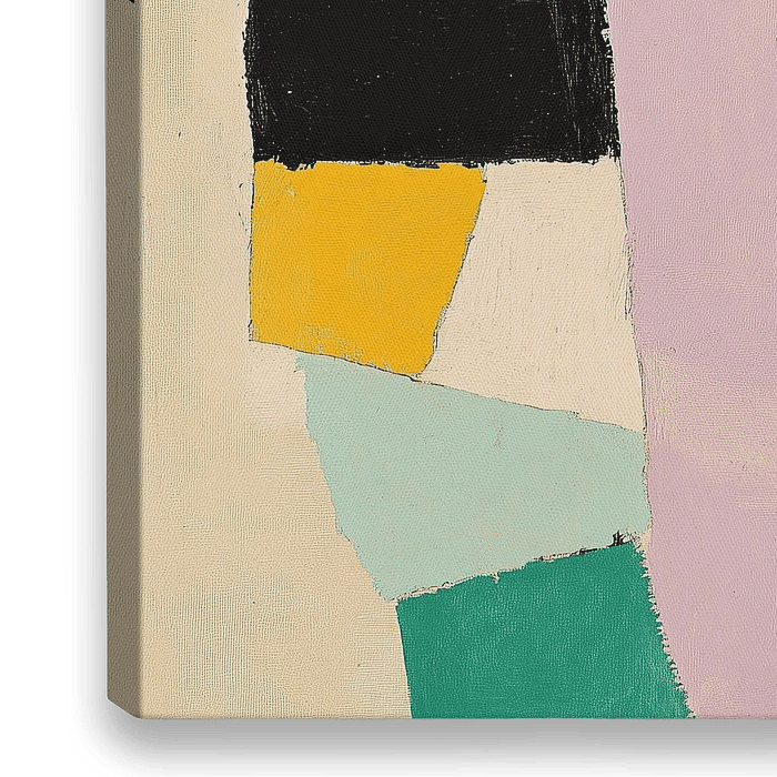 Op Matisse geïnspireerd schilderij met zachte vormen, pastelkleuren en minimalistische vormgeving. In het midden van de compositie staat een zwarte vorm tegen een lichtgele achtergrond met roze en mintgroene kleurblokken.